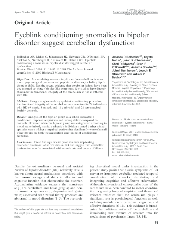 Pdf Eyeblink Conditioning Anomalies In Bipolar Disorder Suggest